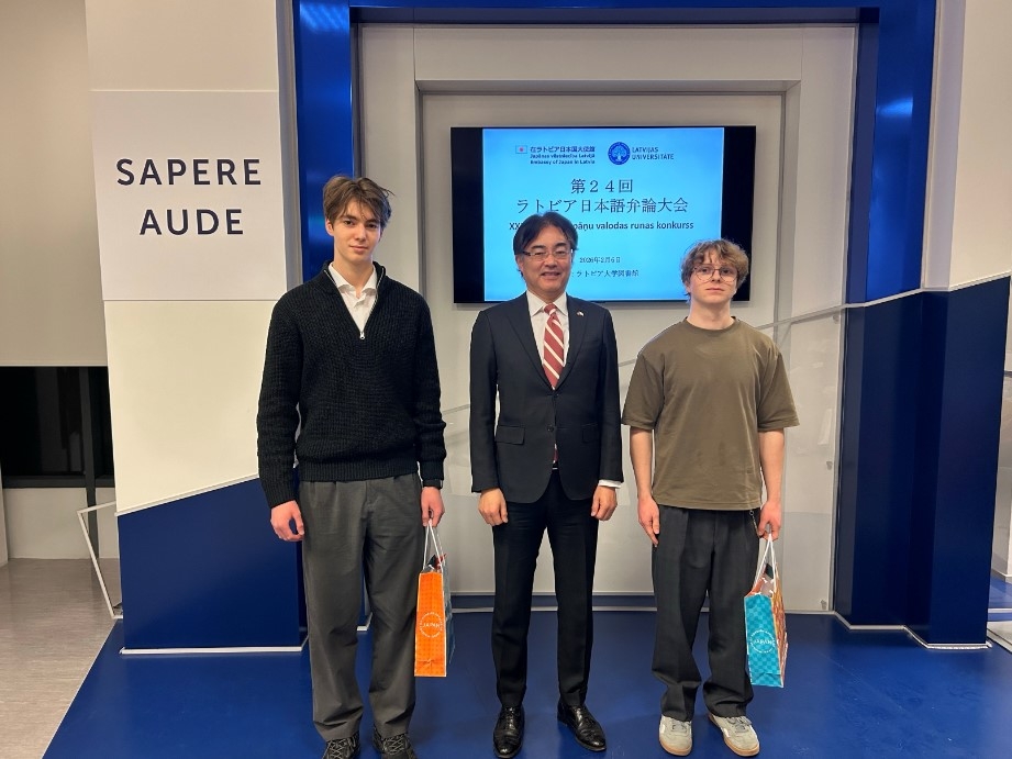 審査員3名(タルトゥ大学日本語講師/宮野恵理様、当館/大庫書記官、当館/エリーゼ職員)による厳正な審査の結果、以下の方々が入賞しました。各部の入賞者には、それぞれ表彰状と記念品が、おしくも入賞できなかった方にも参加賞が吉田大使より授与されました。また、第二部優勝者には、関西日本ラトビア協会のご協力により,ラトビアと日本の往復航空券が授与されました。